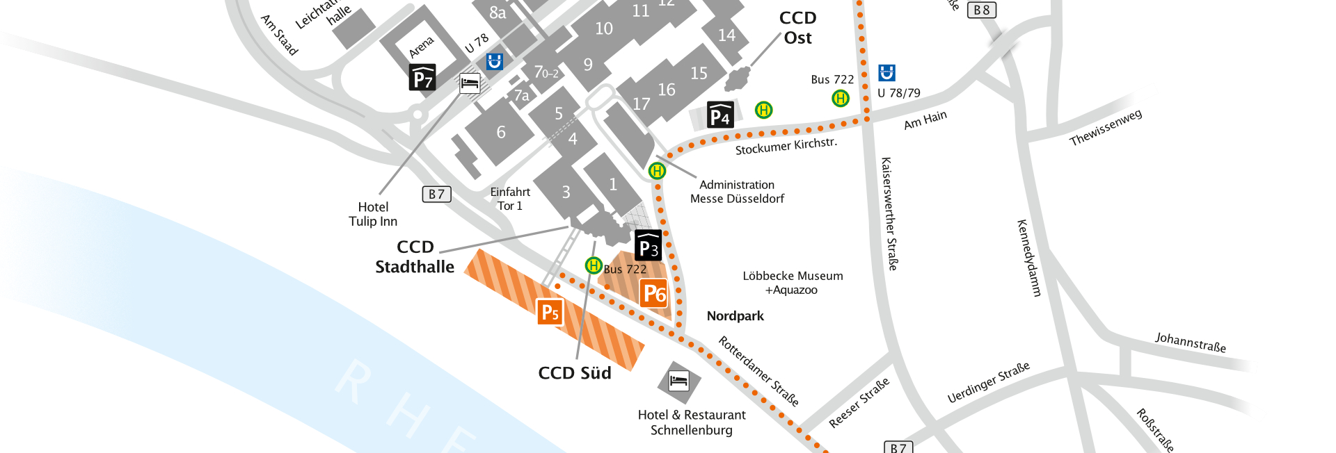Mit der U78 (aus Richtung Innenstadt) und der U79 (aus Richtung Innenstadt, Kaiserswerth, Wittlaer und Duisburg) fahren Sie bis zur Haltestelle Messe Ost/Stockumer Kirchstraße. Von dort erreichen Sie zu Fuß, über die Stockumer Kirchstraße, das CCD Congress Center Düsseldorf in ca. 15 Minuten oder Sie nehmen den Bus 722 bis zur Endhaltestelle Messe Congress Center.Informationen rund um Fahrpläne, Bahn- und Buslinien sowie Tickets erhalten Sie bei der Rheinbahn unter