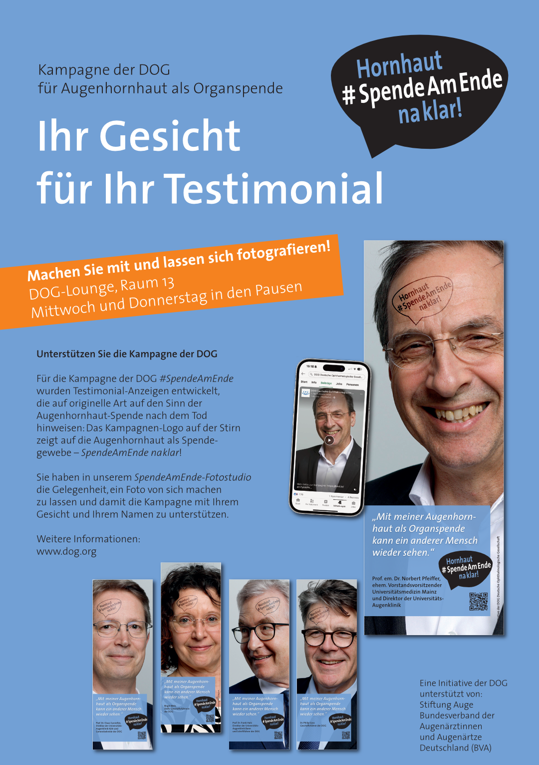 Für die Kampagne der DOG #SpendeAmEnde wurden Testimonial-Anzeigen entwickelt, die auf originelle Art auf den Sinn der Augenhornhaut-Spende nach dem Tod hinweisen: Das Kampagnen-Logo auf der Stirn zeigt auf die Augenhornhaut als Spendegewebe – SpendeAmEnde na klar!